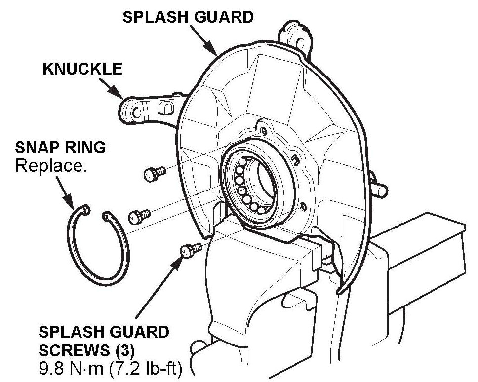 19. Remove the snap ring and the splash guard from the knuckle.