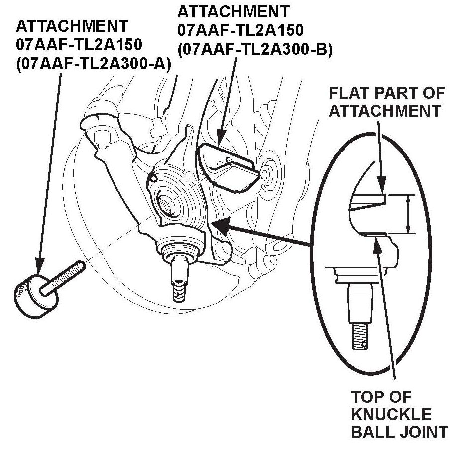 28. Clean and wipe off the hub center, then install the attachments (07AAF-TL2A300-A and B) of the ball joint tool kit through the hub center. Position the projection of the attachment (07AAF-TL2A300-B) toward the lower side of the knuckle. Tighten it into place by hand.