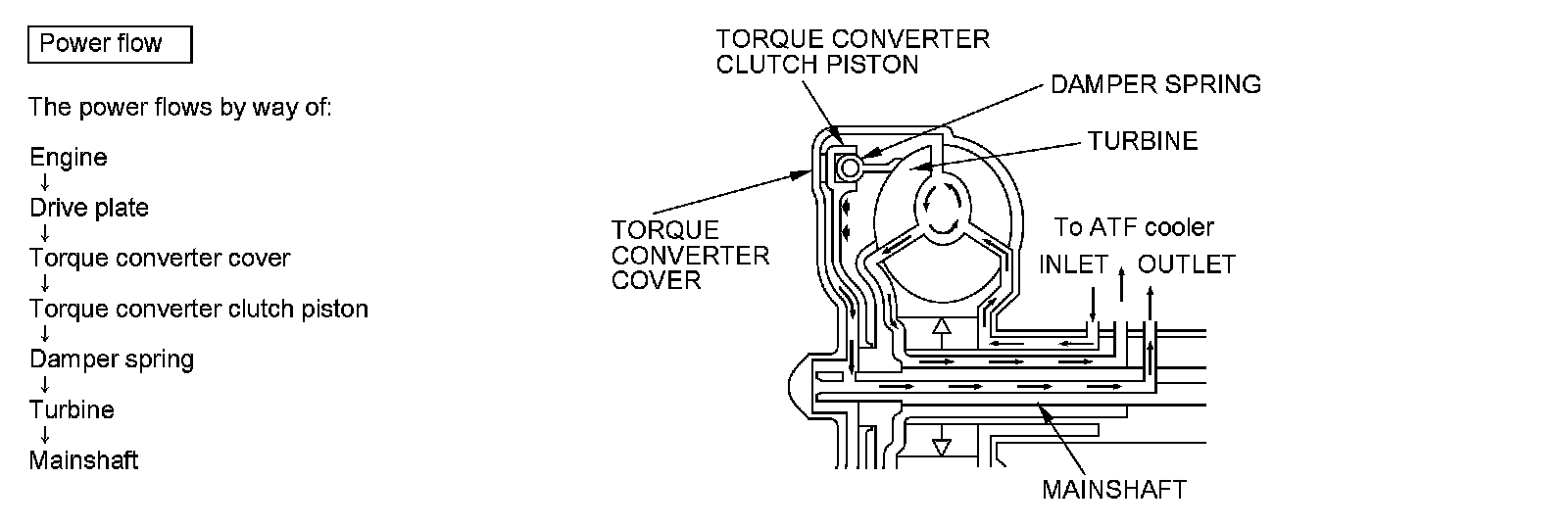 The lock-up mechanism of the torque converter clutch operates in D (2nd, 3rd, 4th, and 5th gears), and in D3 (2nd and 3rd gears). The pressurized fluid is drained from the back of the torque converter through a fluid passage, causing the torque converter clutch piston to be held against the torque converter cover. As this takes place, the mainshaft rotates at the same speed as the engine crankshaft. Together with the hydraulic control, the PCM optimizes the timing and amount of the lock-up mechanism. When shift solenoid valve E is turned on by the PCM, shift solenoid valve E pressure switches the lock-up shift valve on. A/T clutch pressure control solenoid valve A and the lock-up control valve control the amount of the lock-up.