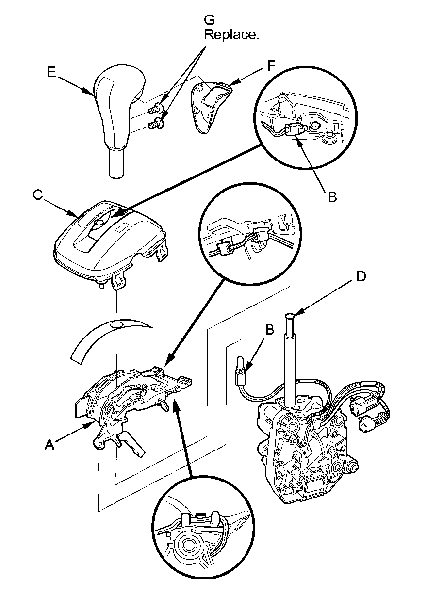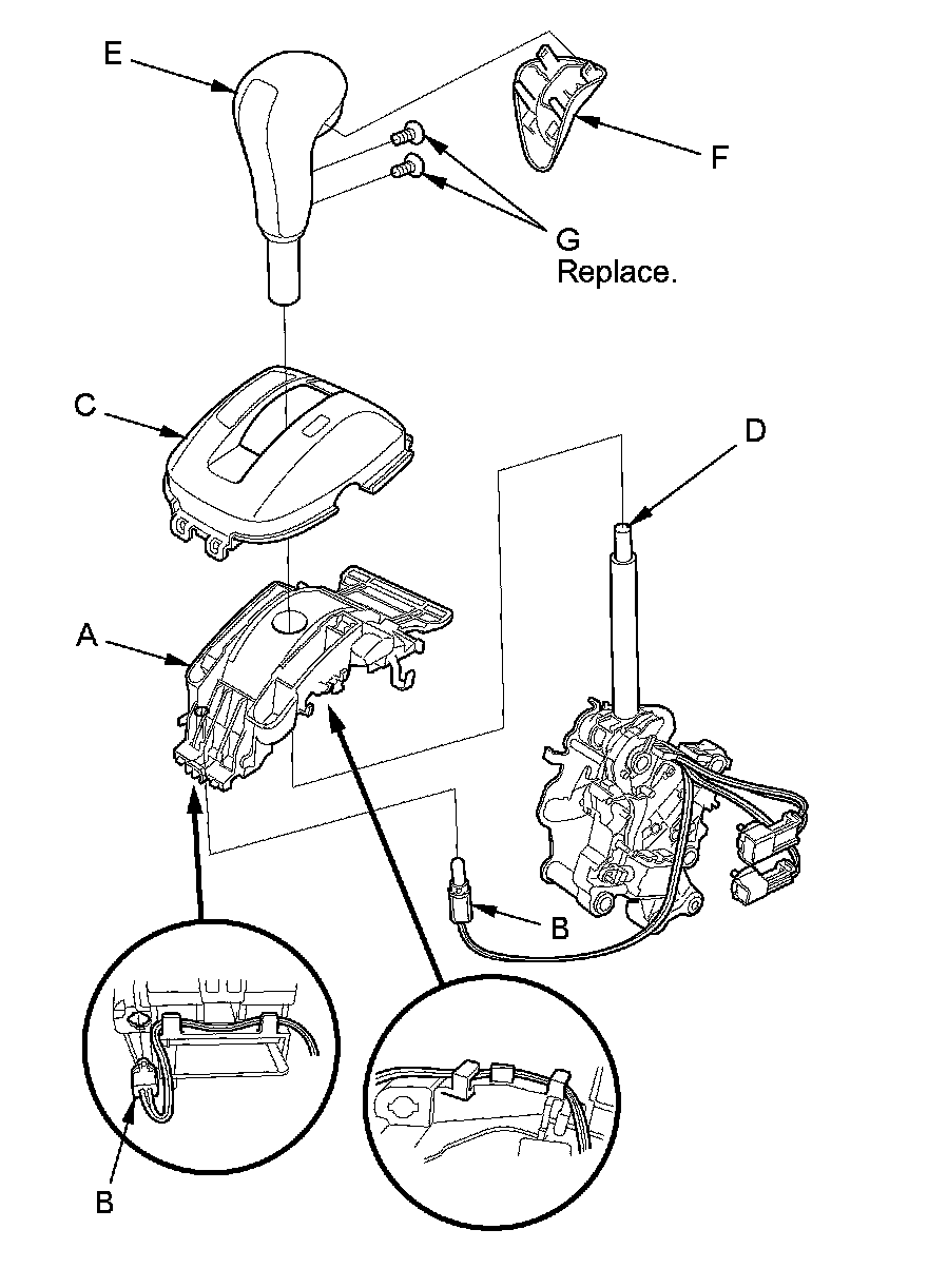 19. Install the shift lever knob cover (F) on the shift lever knob with new screws (G).