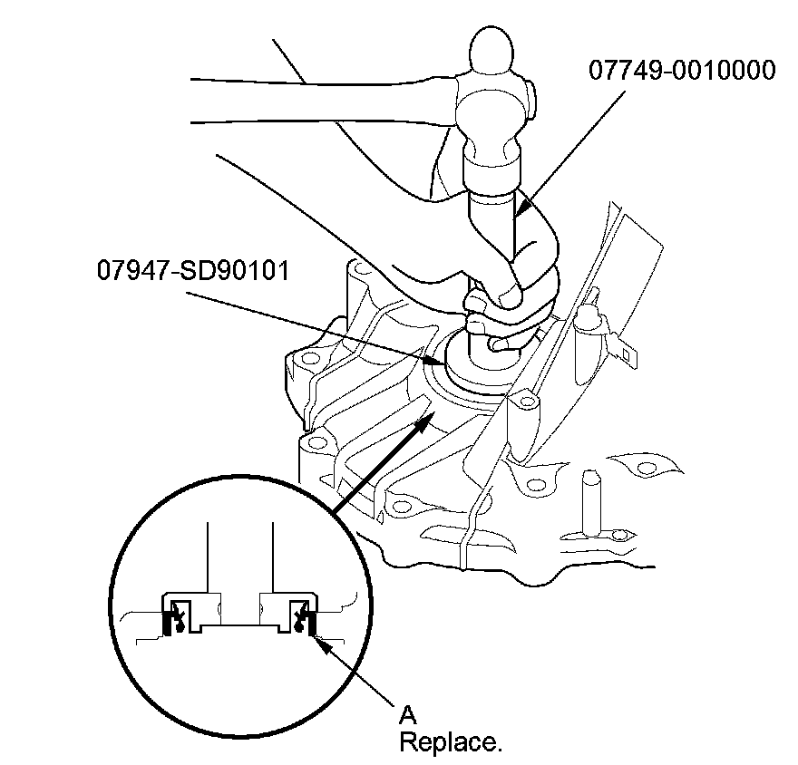 3. Install a new oil seal (A) flush with the transmission housing using the driver handle and the oil seal driver attachment.