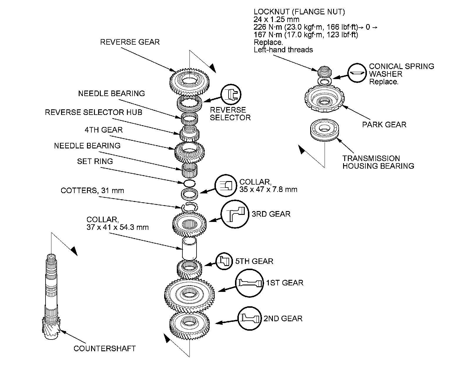 6. Replace the locknut and the conical spring washer with new ones when assembling the transmission. The countershaft locknut has left-hand threads.