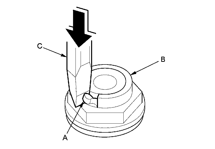 10. Cut the lock tab (A) of the each shaft locknut (B) using a chisel (C). Then remove the locknuts and the conical spring washers from each shaft.
