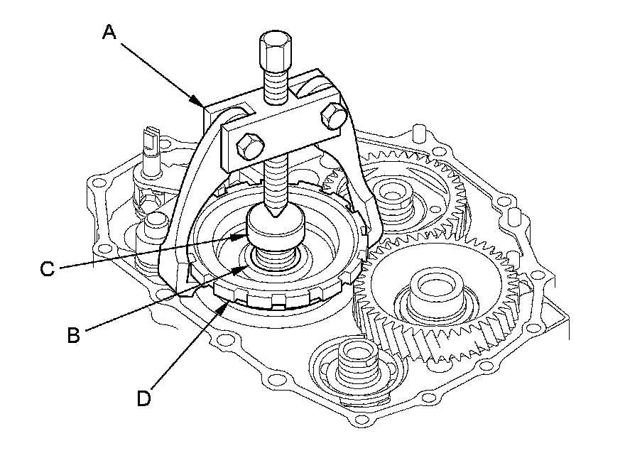 12. Set a two-jaw (or three-jaw) puller (A) on the countershaft (B) with a spacer (C) between the puller and the countershaft, then remove the park gear (D).