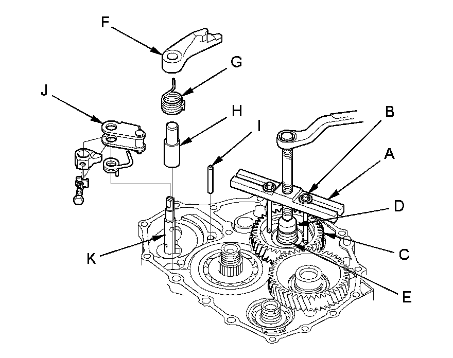 15. Remove the park lever (J) from the selector control shaft (K).