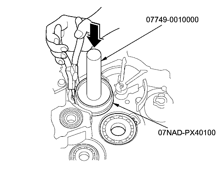 3. To remove the secondary shaft bearing and the idler gear shaft bearing, expand each snap ring using snap ring pliers, then drive the bearing out using the driver handle and the 42 x 47 mm bearing driver attachment.
