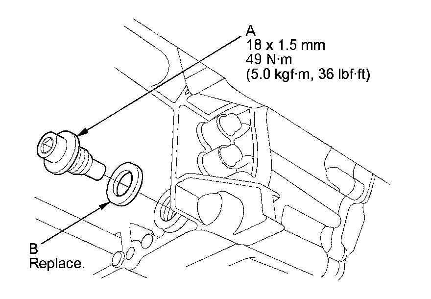 3. Remove the drain plug (A), and drain the ATF. Then reinstall the drain plug with a new sealing washer (B).