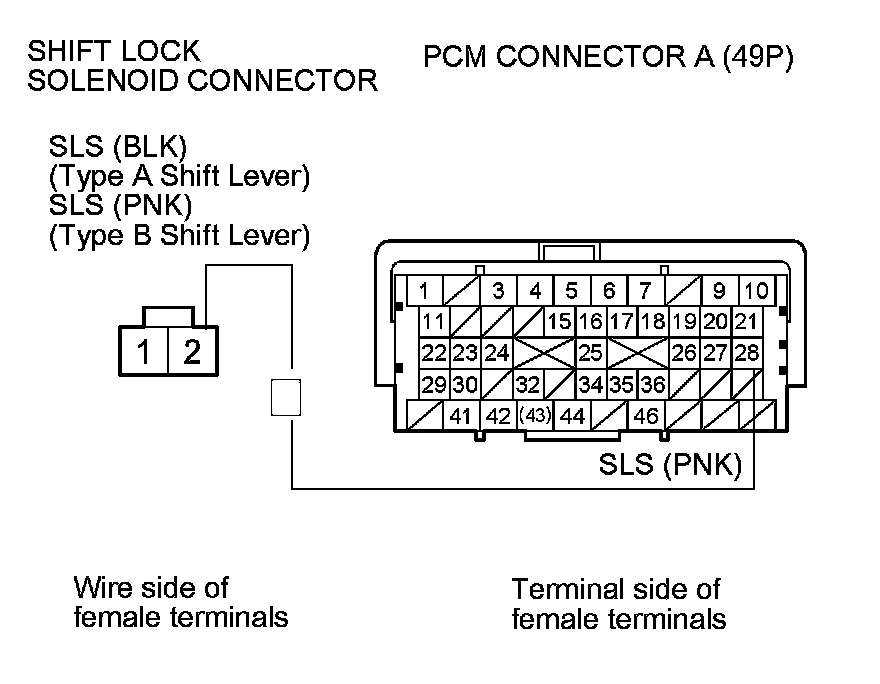 15. Check for continuity between PCM connector terminal A28 and shift lock solenoid connector terminal No. 2.