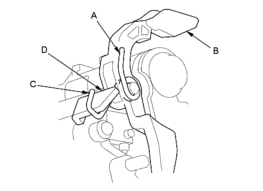 16. Make sure that the release spring end (A) is installed in the shift lock release (B), and the hooked end (C) is on the stop (D).