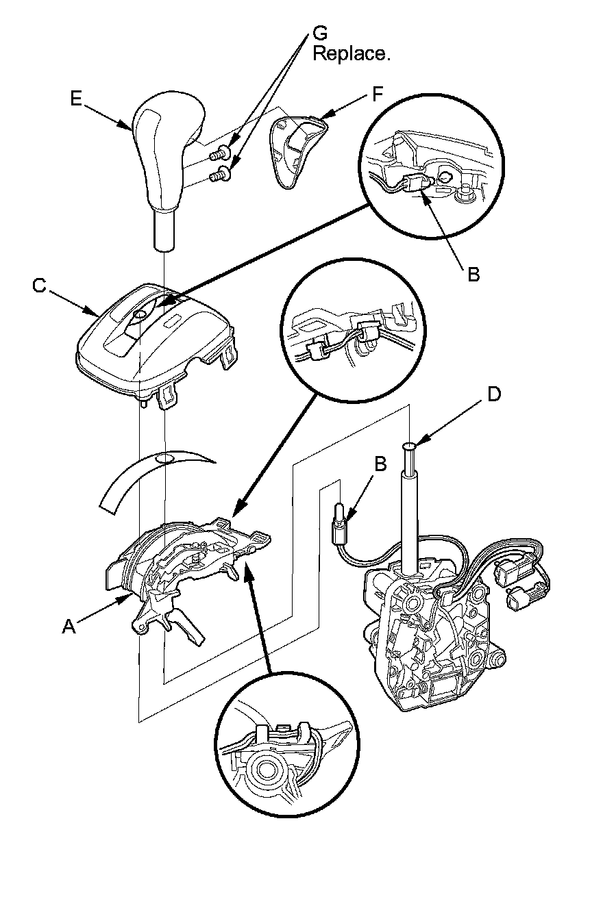 19. Install the shift lever knob cover (F) on the shift lever knob with new screws (G).