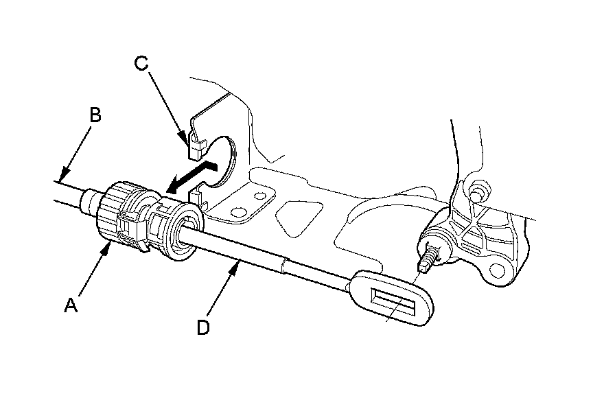 6. Slide the socket holder (A) away from the bracket as shown to remove the shift cable (B) from the shift cable bracket (C). Do not remove the shift cable by pulling the shift cable guide (D).