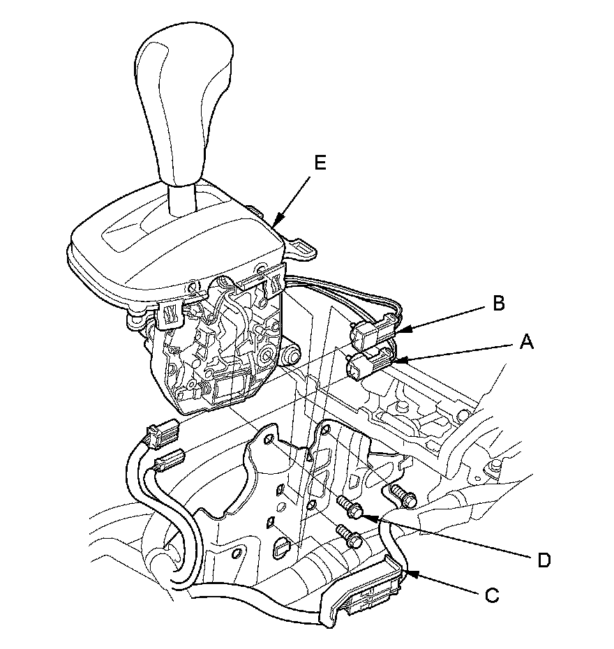 9. Remove the shift lever mounting bolts (D), then remove the shift lever assembly (E).