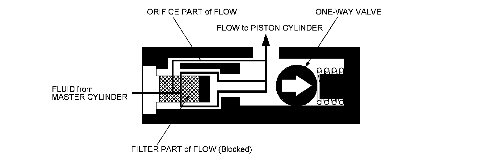 When the clutch pedal is pressed, the fluid pressure from the master cylinder moves the one-way valve in the direction shown in the illustration. The fluid flows through two passages: the orifice part and the filter part. It then flows out to the piston cylinder to release the pressure plate and clutch disc joint.