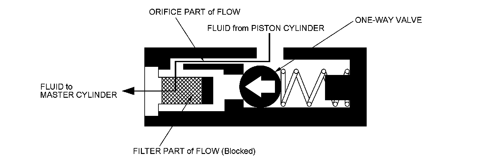 When the clutch pedal is released, the fluid pressure from the piston cylinder moves the one-way valve in the direction shown in the illustration. The one-way valve blocks the filter-part passage and delays the clutch release speed by returning the fluid to the master cylinder through only the orifice-part passage.