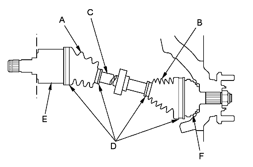 3. Check the inboard joint (E) and the outboard joint (F) for cracks and damage. If any damage is found, replace the inboard joint or the outboard joint as an assembly.