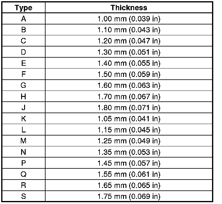 7. If the clearance exceeds the standard, select a new 80 mm shim from the following table. If the clearance measured in step 6 is within the standard, go to step 10.