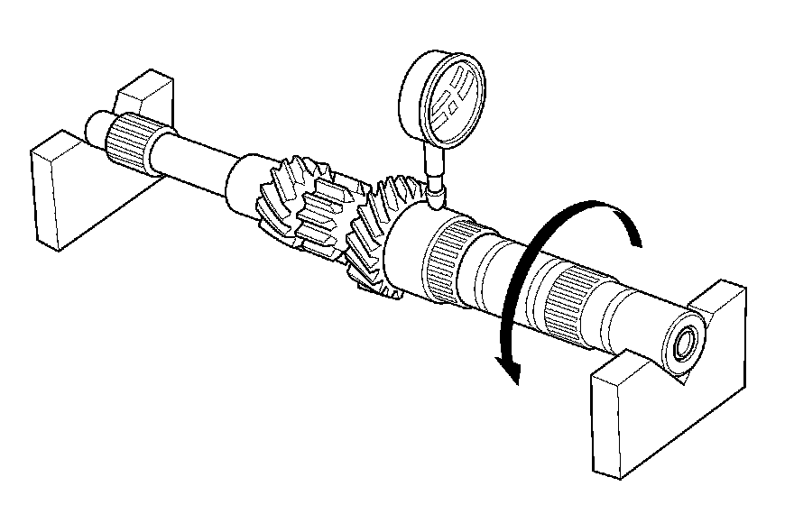 2. Inspect the runout by supporting both ends of the mainshaft. Then rotate the mainshaft two complete turns while measuring with a dial gauge. If the runout exceeds the service limit, replace the mainshaft.