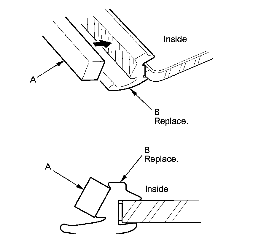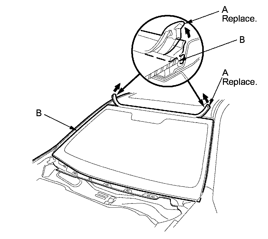 2. Remove the windshield molding (A) from the upper edge of the windshield (B). If necessary, cut the windshield molding with a utility knife.