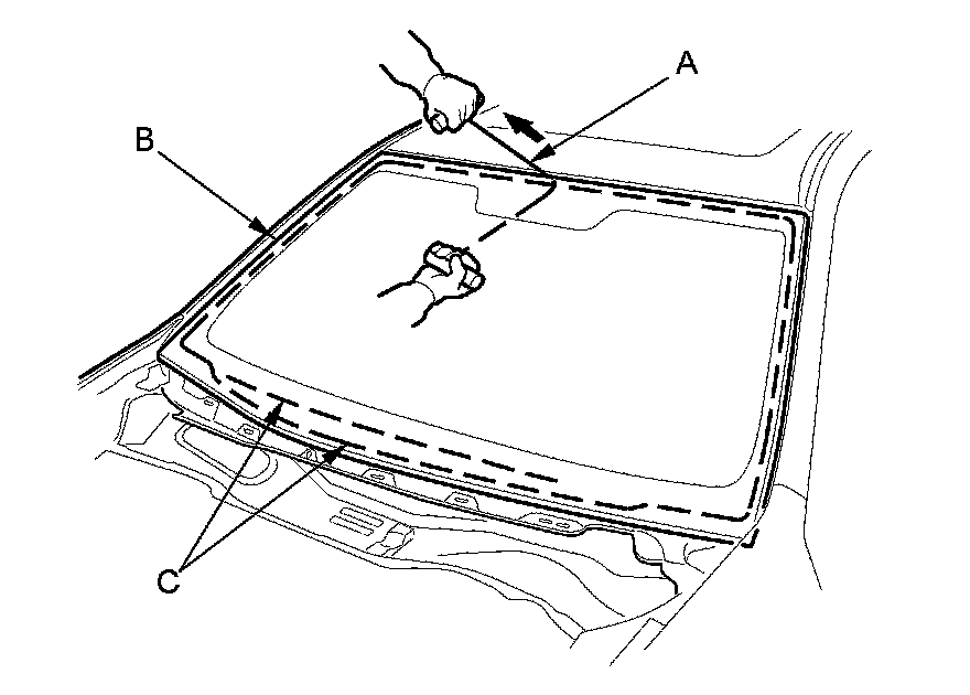 6. With a helper on the outside, pull the piano wire (A) back and forth in a sawing motion. Hold the piano wire as close to the windshield (B) as possible to prevent damage to the body and the dashboard. Carefully cut through the rubber dam and the adhesive (C) around the entire windshield.
