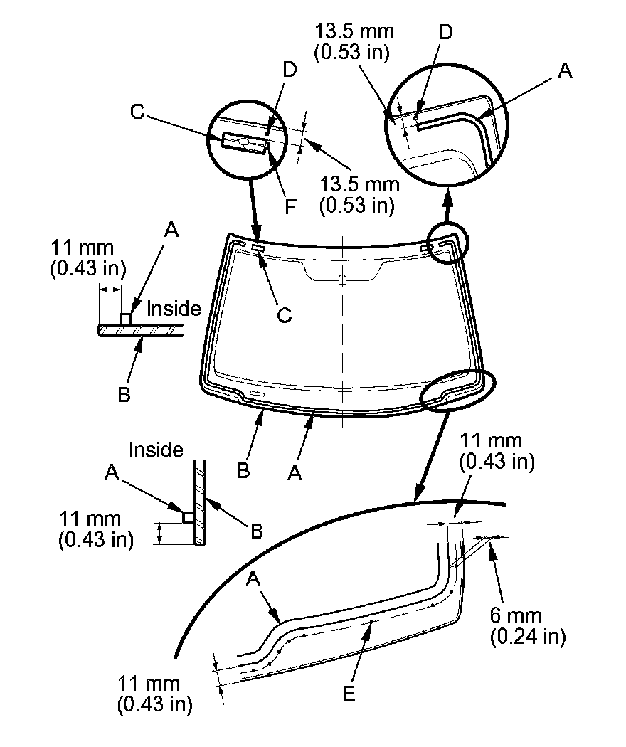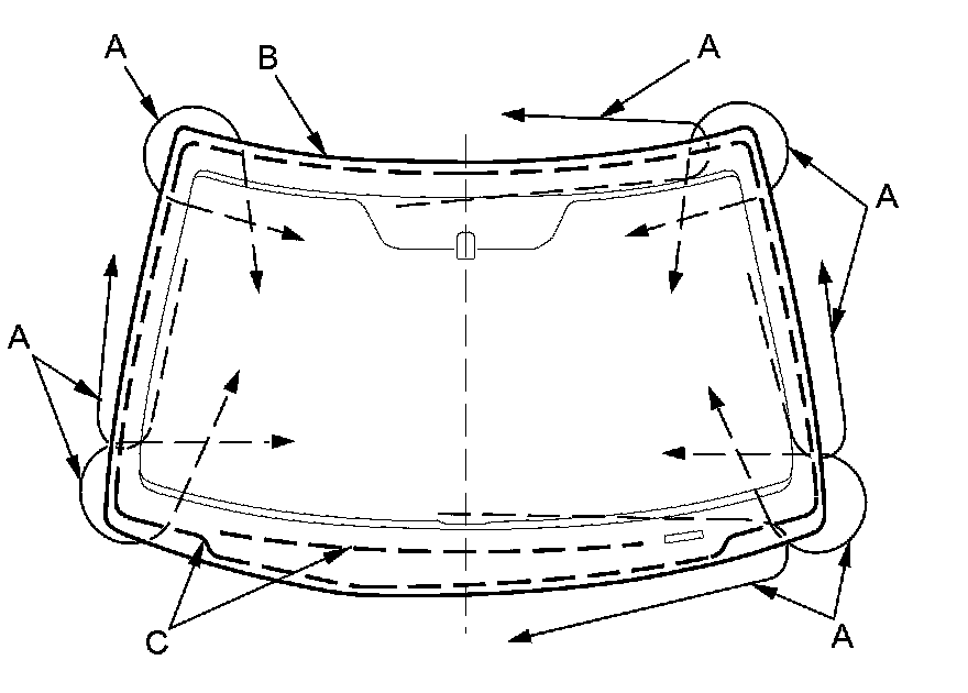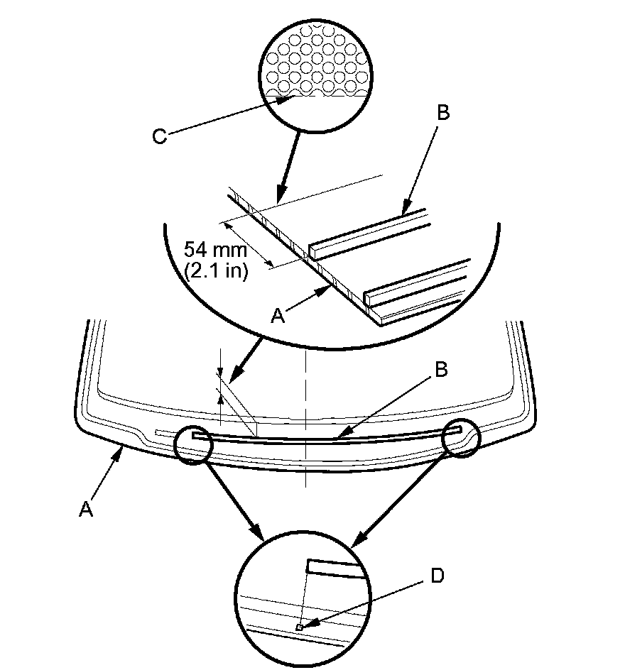 12. Apply glass primer to the upper clips mounting areas on the windshield (B), and let it dry. Remove the adhesive backing and attach the rubber dam A and the upper clips (C) to the inside of the windshield as shown: