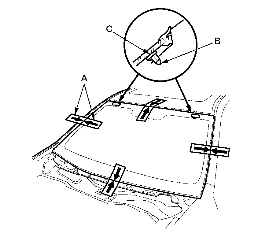 16. If you are installing a new windshield, set the windshield in the opening, and center it. Make alignment marks (A) across the windshield and the body with a grease pencil at the four points shown. Make sure the pins (B) of both upper clips (C) contact with the edge of the body holes. Be careful not to touch the windshield where the adhesive will be applied.