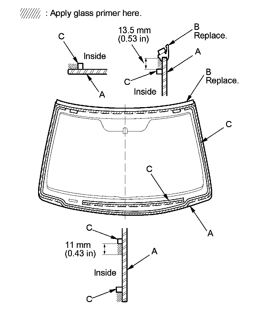 13. Attach rubber dam B with adhesive tape to the inside surface of the windshield (A) as shown, using the edge of the black ceramic-coated area (C) as a guide.