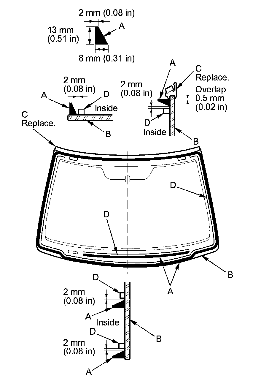 21. Put the cartridge in a caulking gun, and run a continuous bead of the adhesive (A) around the windshield (B) along the edge of the windshield molding (C) and the rubber dams (D) as shown. Apply adhesive within 30 minutes after applying the glass primer. Make a slightly thicker bead at each corner.