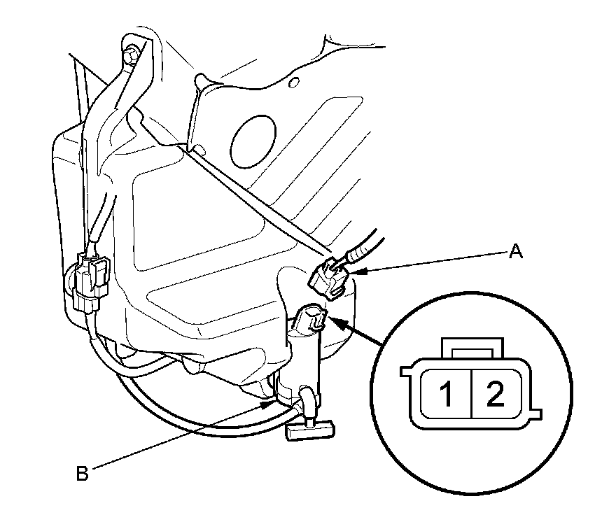 2. Disconnect the 2P connector (A) from the windshield washer motor (B).