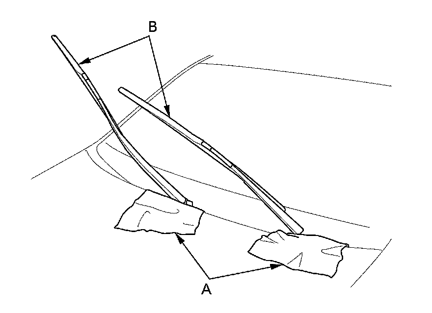 3. Raise the wiper arms (B) off the windshield, then remove the wiper arms.