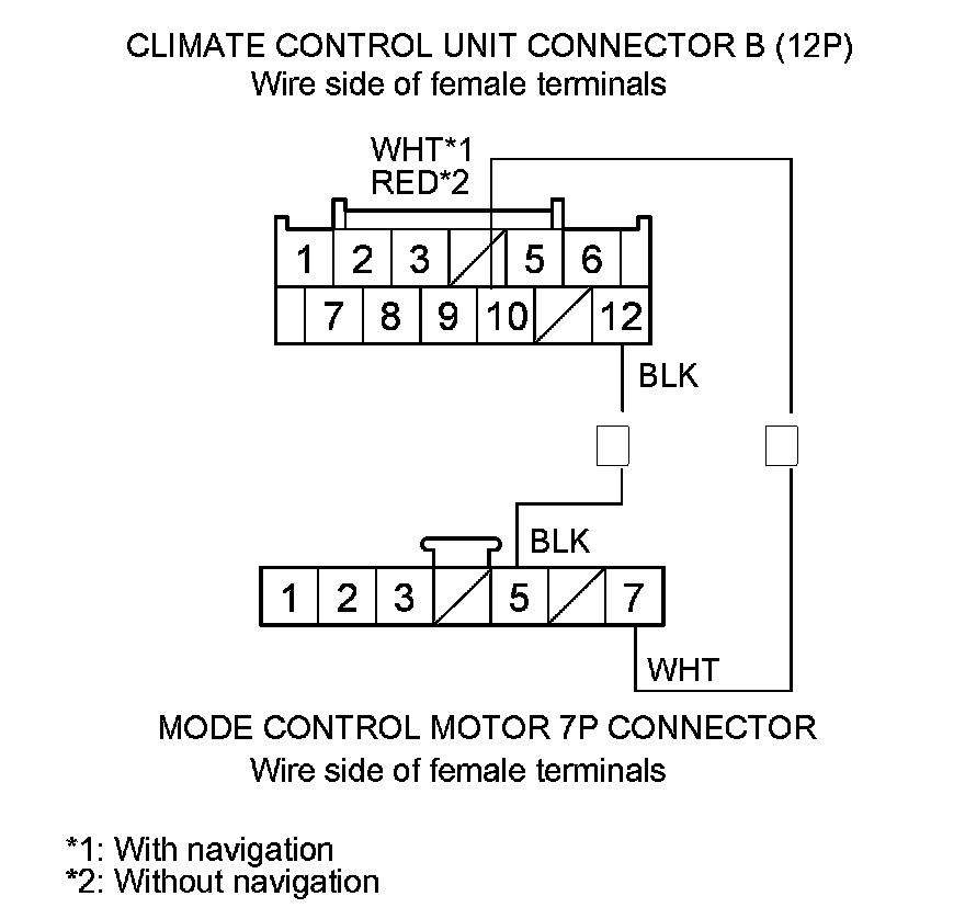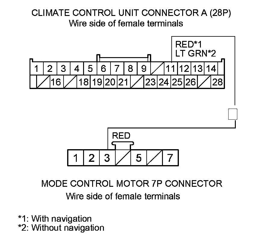 Check for loose wires or poor connections at climate control unit connectors A (28P), B (12P), and at the mode control motor 7P connector. If the connections are good, substitute a known-good climate control unit and recheck. If the symptom/indication goes away, replace the original climate control unit (with navigation) Climate Control Unit Removal/Installation (With Navigation), (without navigation) Climate Control Unit Removal/Installation (Without Navigation).�