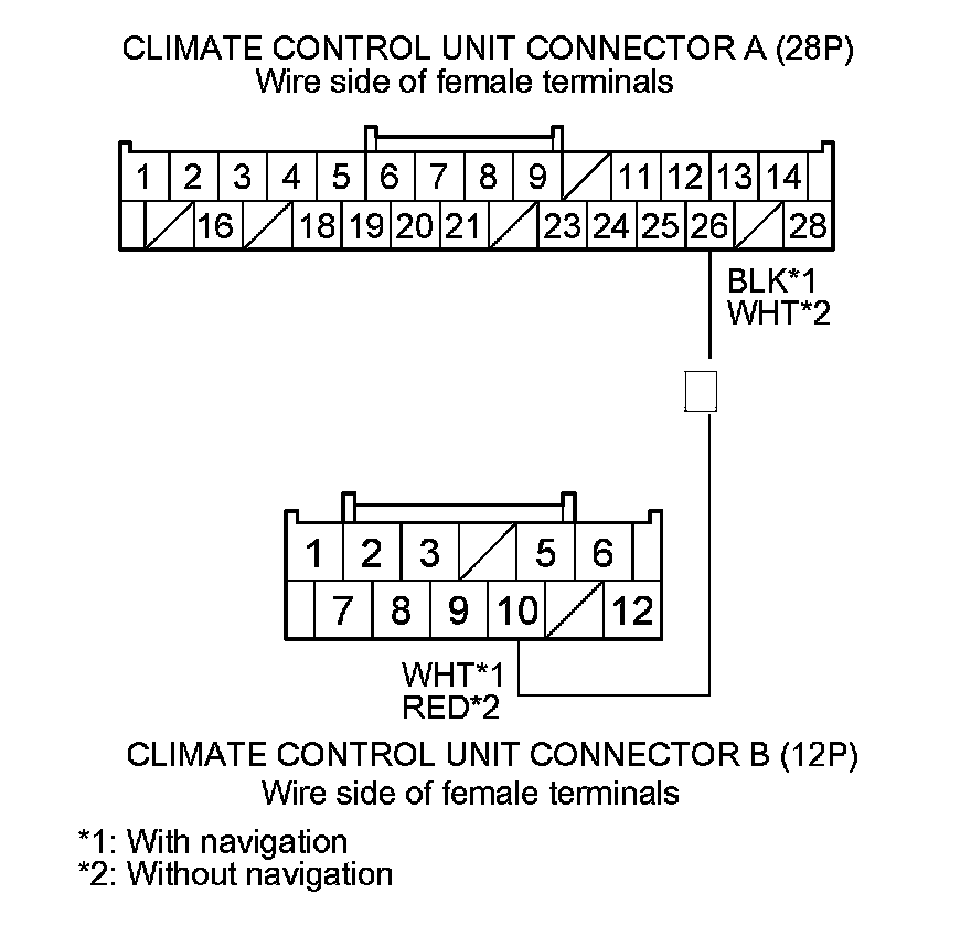 9. Check for continuity between climate control unit connector A (28P) terminal No. 26 and climate control unit connector B (12P) terminal No. 10.