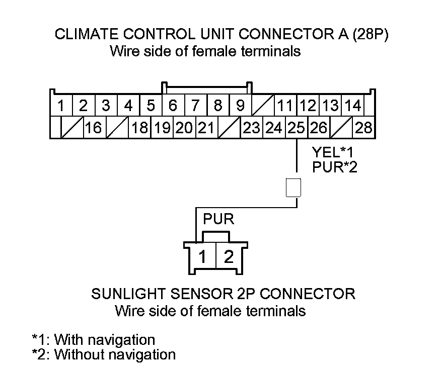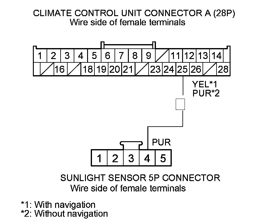 8. Check for continuity between climate control unit connector A (28P) terminal No. 25 and sunlight sensor 5P connector terminal No. 4 (with automatic lighting), or sunlight sensor 2P connector terminal No. 1 (without automatic lighting).