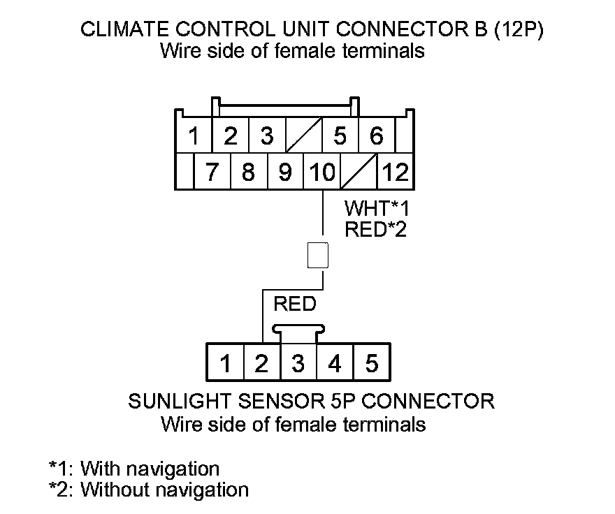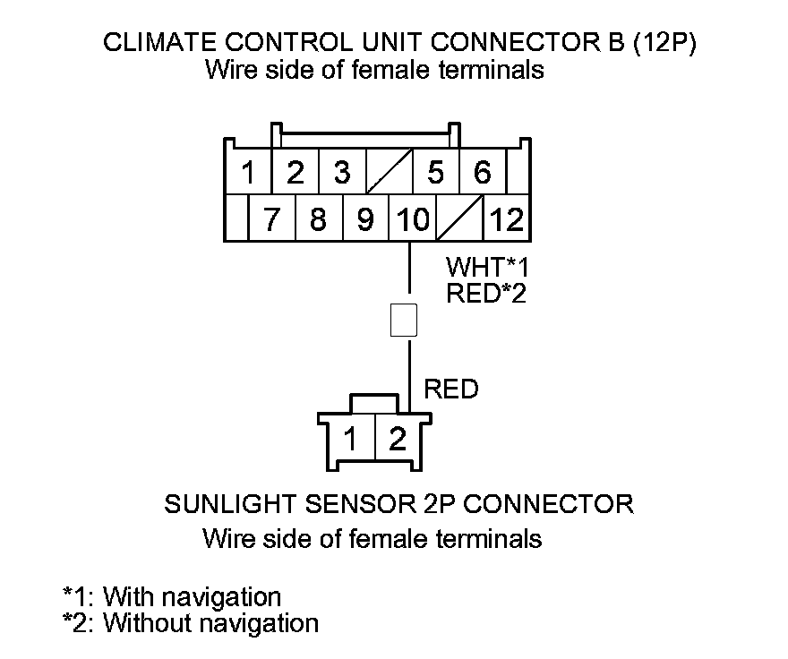 9. Check for continuity between climate control unit connector B (12P) terminal No. 10 and sunlight sensor 5P connector terminal No. 2 (with automatic lighting), or sunlight sensor 2P connector terminal No. 2 (without automatic lighting).