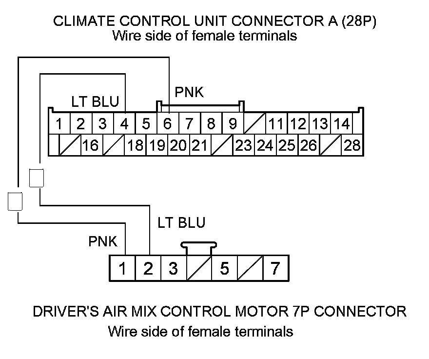 9. Check for continuity between the following terminals of climate control unit connector A (28P) and the driver's air mix control motor 7P connector.