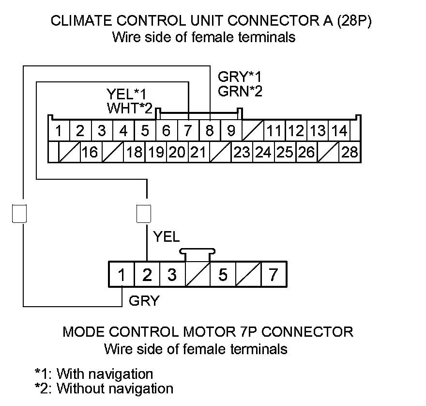 8. Check for continuity between the following terminals of climate control unit connector A (28P) and the mode control motor 7P connector.