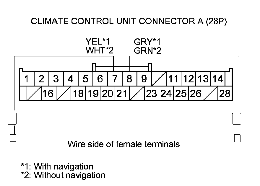 9. Check for continuity between body ground and climate control unit connector A (28P) terminals No. 7 and No. 8 individually.