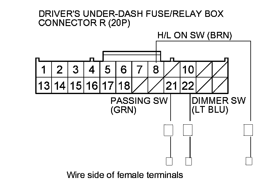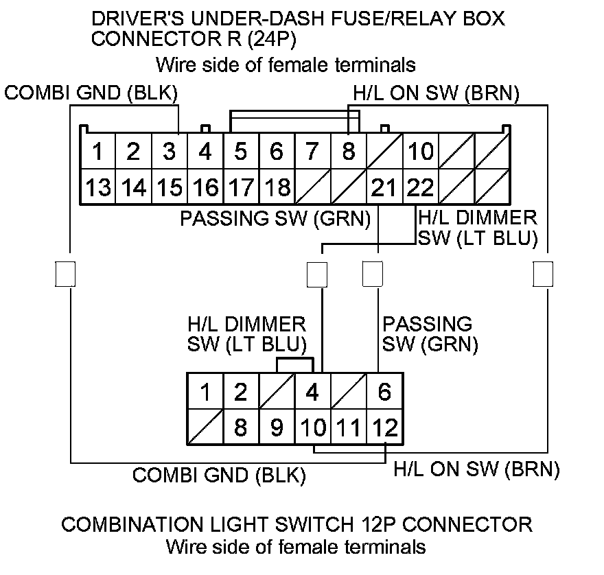 20. Check for continuity between driver's under-dash fuse/relay box connector R (24P) terminals and the combination light switch 12P connector terminals as shown: