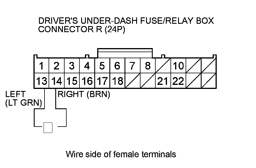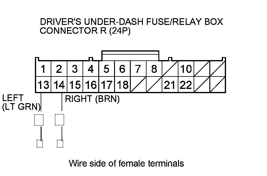11. Check for continuity between driver's under-dash fuse/relay box connector R (24P) terminals No. 13 and No. 14.