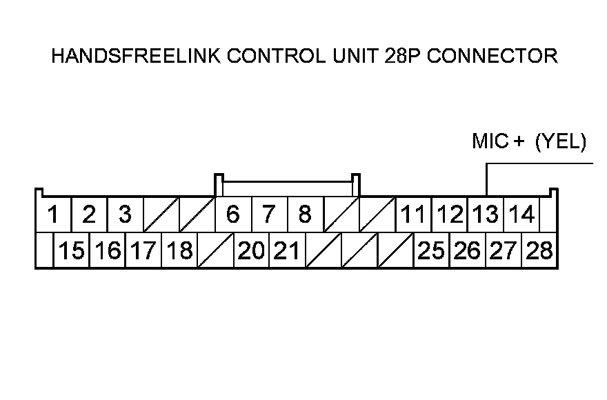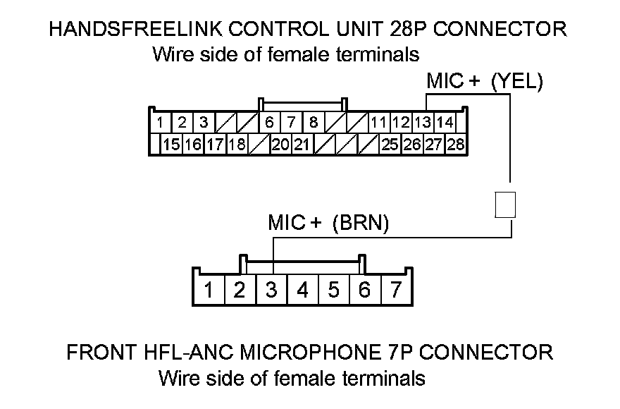 11. Check for continuity between HandsFreeLink control unit 28P connector terminal No. 13 and front HFL-ANC microphone 7P connector terminal No. 3.