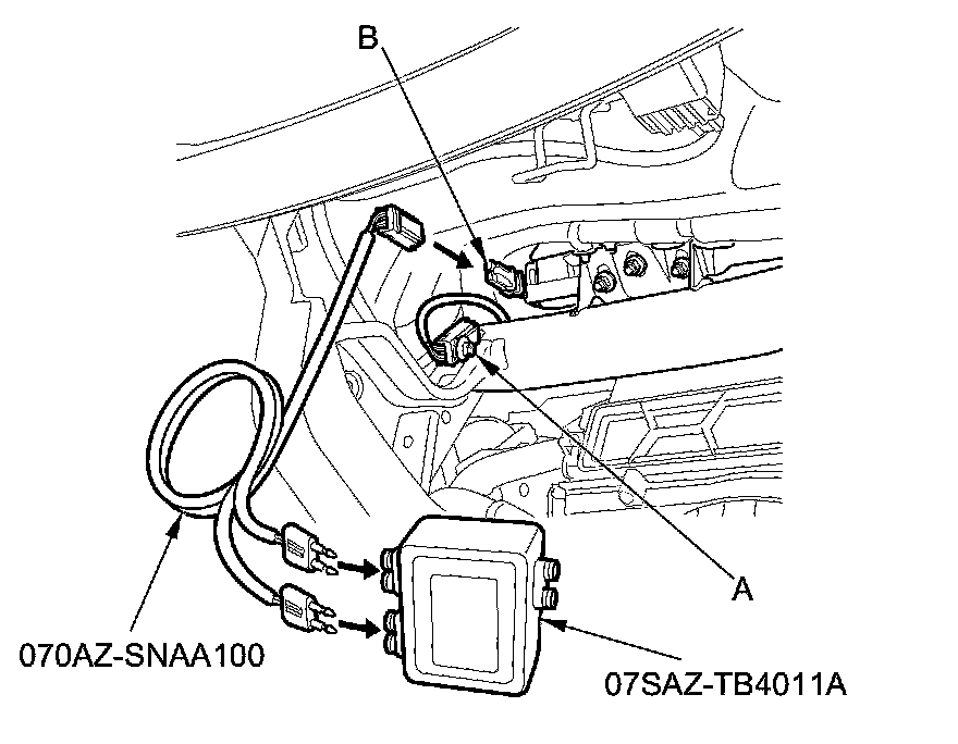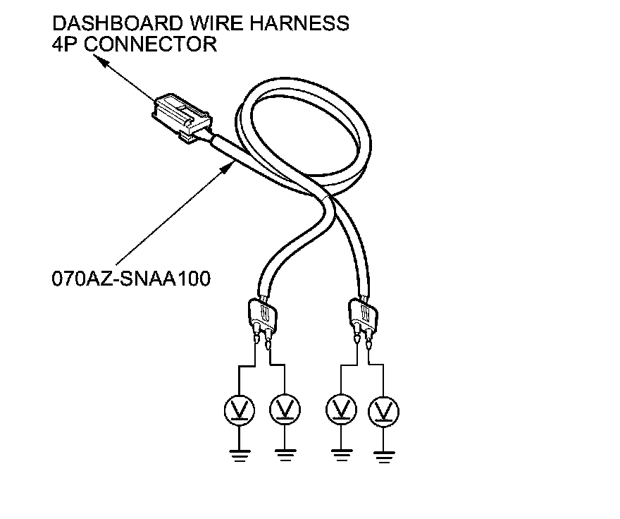 8. Connect the terminals of SRS simulator lead J to the SRS inflator simulator (2 Ohms connectors), and then connect SRS simulator lead J to the dashboard wire harness 4P connector.