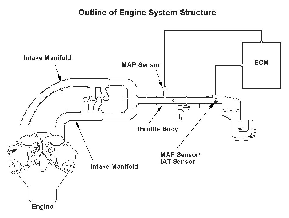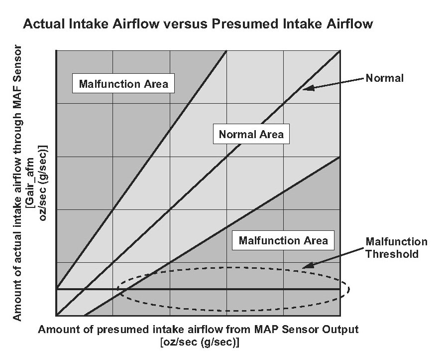 The mass airflow (MAF) sensor directly measures the amount of intake airflow into the engine, and the engine control module (ECM) controls the fuel injection based on the measured value. The manifold absolute pressure (MAP) sensor measures the intake manifold pressure, and the ECM calculates the amount of intake airflow from the MAP sensor output and the engine revolutions. The ECM compares the MAF sensor output (amount of intake airflow) and the amount of intake airflow calculated from MAP sensor output. If their difference is too large (in the malfunction area), the ECM detects a malfunction and stores a DTC.