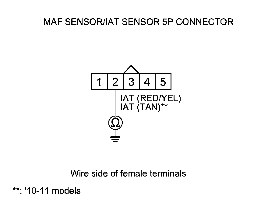 10. Check for continuity between MAF sensor/IAT sensor 5P connector terminal No. 2 and body ground.