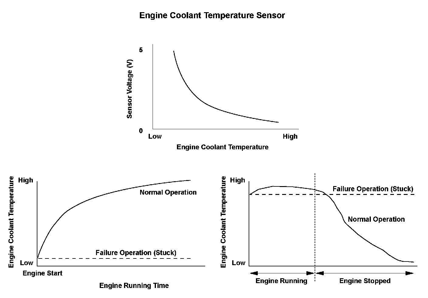 The engine control module (ECM)/powertrain control module (PCM) supplies voltage to the engine coolant temperature (ECT) signal circuit (about 5 V) through a pull-up resistor. As the engine coolant cools, ECT sensor 1 resistance increases, and the ECM/PCM detects a high signal voltage. As the engine coolant warms, ECT sensor 1 resistance decreases, and the ECM/PCM detects a low signal voltage. If the ECT sensor 1 output voltage does not reach a set temperature after starting the engine and driving a set time, or when the difference between the ECT sensor 1 output voltage while driving and the output voltage of ECT sensor 1 after the engine has been stopped a certain length of time does not change a certain amount, the ECM/PCM detects a malfunction and stores a DTC.