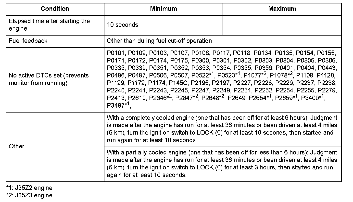 When the difference between the coolant temperature after 36 minutes or more of running time or 4 miles (6 km) or more of driving time the coolant temperature after the engine has been off for 4 hours and then ran for 10 seconds is 18 °F (10 °C) or less, a malfunction is detected.