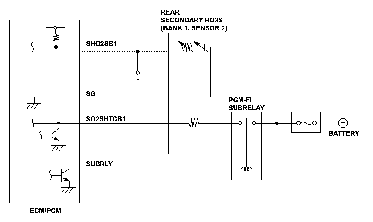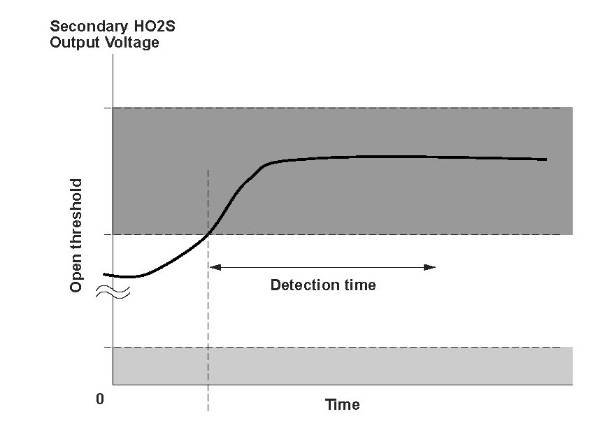 The rear secondary heated oxygen sensor (HO2S) (bank 1, sensor 2) detects the oxygen content in the exhaust gas downstream of the three way catalytic converter (TWC) during stoichiometric air/fuel ratio feedback control. The rear secondary HO2S controls the air/fuel ratio from the rear A/F sensor output voltage to optimize the TWC efficiency. After current is applied to the rear secondary HO2S heater, if the rear secondary HO2S output continues to exceed the upper limit used during feedback control, the engine control module (ECM)/ powertrain control module (PCM) detects a malfunction and stores a DTC.