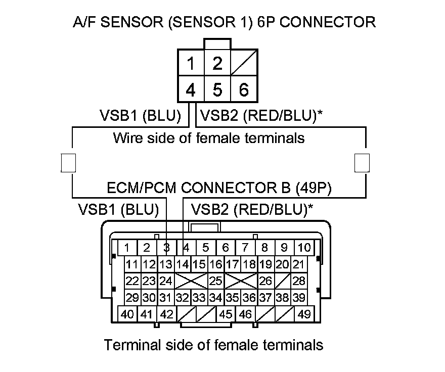 Repair open in the wire between the ECM/PCM (B13 (B14)*) and the A/F sensor (Sensor 1), then go to step 14.