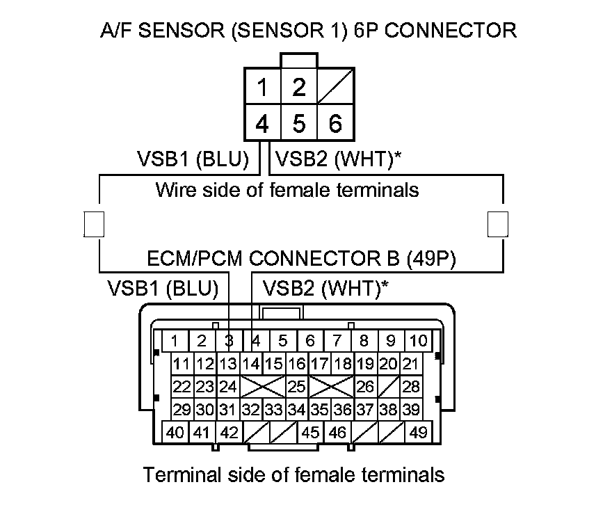 9. Check for continuity between A/F sensor (Sensor 1) 6P connector terminal No. 4 and ECM/PCM connector terminal B13 (B14)*.