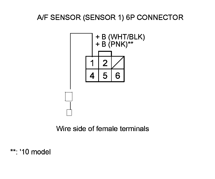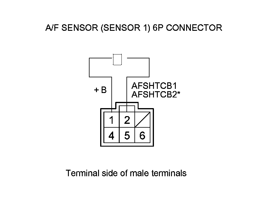 10. At the sensor side, measure the resistance between A/F sensor (Sensor 1) 6P connector terminals No. 1 and No. 2.