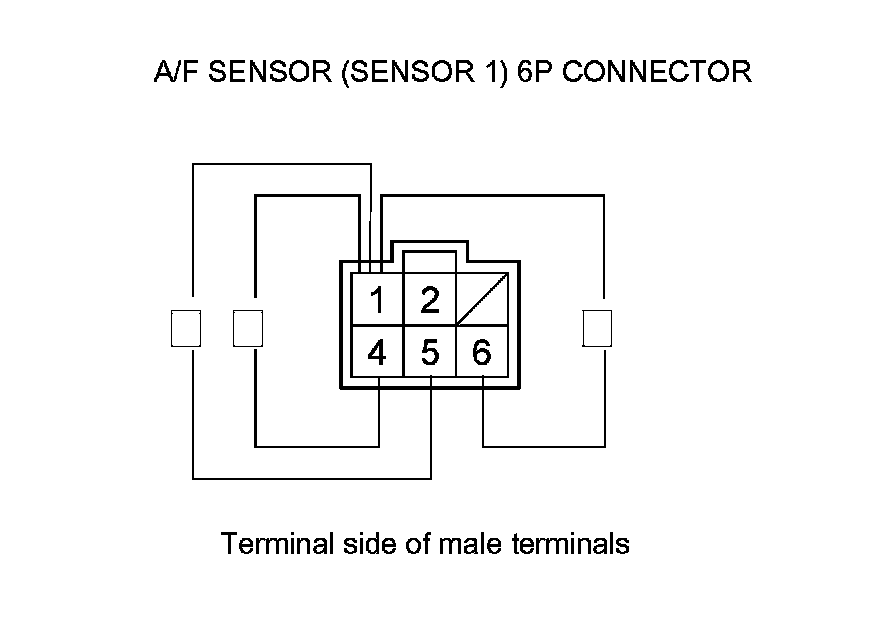 12. At the sensor side, check for continuity between A/F sensor (Sensor 1) 6P connector terminal No. 1 and each of the other terminals in the connector individually.