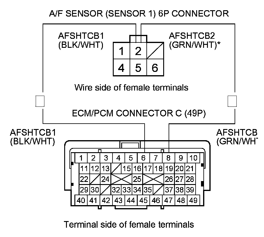 16. Check for continuity between A/F sensor (Sensor 1) 6P connector terminal No. 2 and ECM/PCM connector C6 (C8)*.